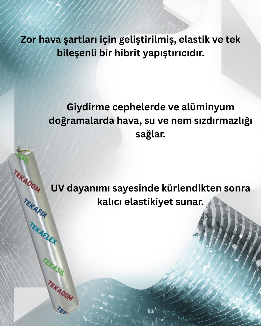 Zor hava şartları için geliştirilen, yüksek kaliteli, elastik ve tek bileşenli hibrit bir yapıştırıcıdır. Giydirme cephelerde, alüminyum doğrama ve pencere kenarlarında hava, su ve nem sızdırmazlığı sağlar ve birçok yüzeye güçlü şekilde yapışır. UV ışınlarına dayanıklı yapısı sayesinde kürlendikten sonra kalıcı elastikiyet sunar.