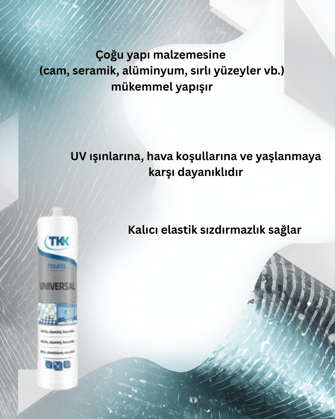 Tekasil Genel Amaçlı Silikon, kalıcı elastik sızdırmazlık sağlayan asetat esaslı bir silikon olup cam, seramik, alüminyum, sırlı yüzeyler, profilli cam (kopelit), klinker ve porselen gibi çoğu silikat esaslı yapı malzemesine mükemmel yapışır, kürleştikten sonra üstün mekanik özellikler kazanır, dikey derzlerde çökmez ve UV ışınlarına, tüm atmosferik koşullara ile yaşlanmaya karşı yüksek dayanım gösterir.